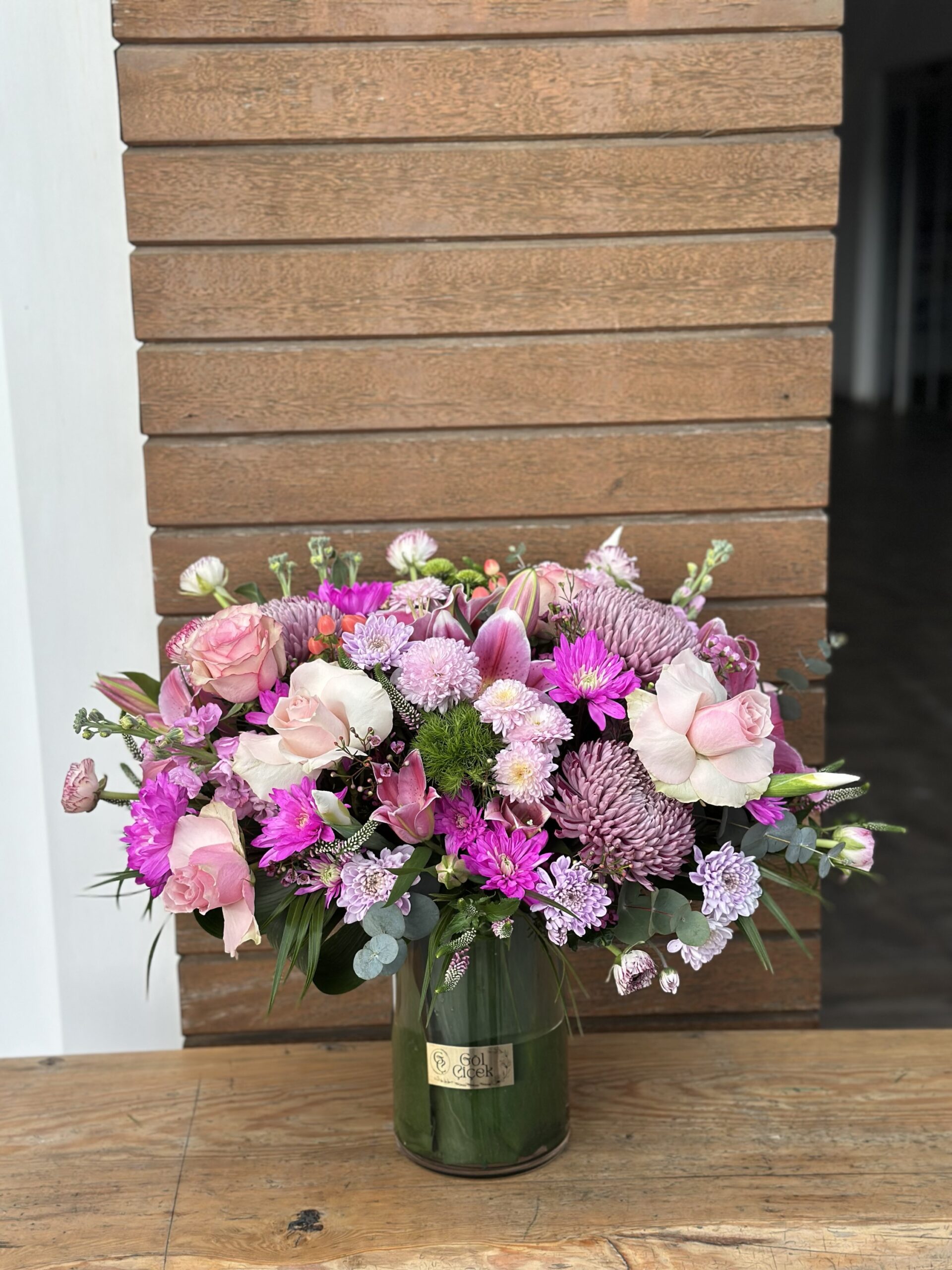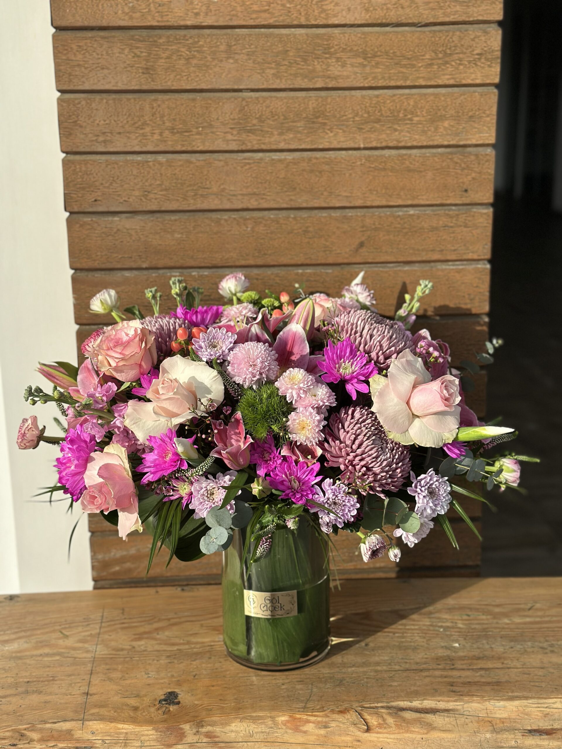 Yumuşak pembe tonlarının romantik uyumuyla hazırlanan bu özel aranjman; güller, krizantemler ve mevsimin en taze çiçeklerinin özenle bir araya getirilmesiyle tasarlanmıştır. Cam vazosu ve doğal yeşillikleriyle hem modern hem de sıcak bir görünüm sunar.